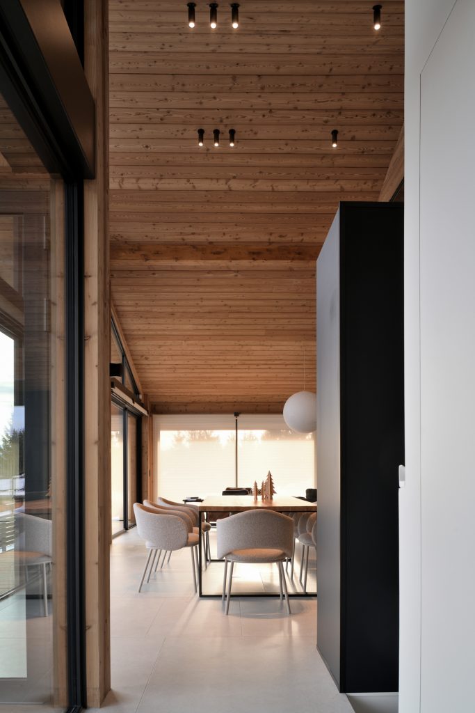 Les espaces à vivre ouverts s’enchaînent dans une fluidité naturelle, baignés de lumière grâce aux grandes baies vitrées et aux doubles hauteurs. Les matériaux – mélèze brossé, pierre brute, touches de métal sombre – rythment les perspectives, habillent les volumes et guident le regard à travers l’espace.