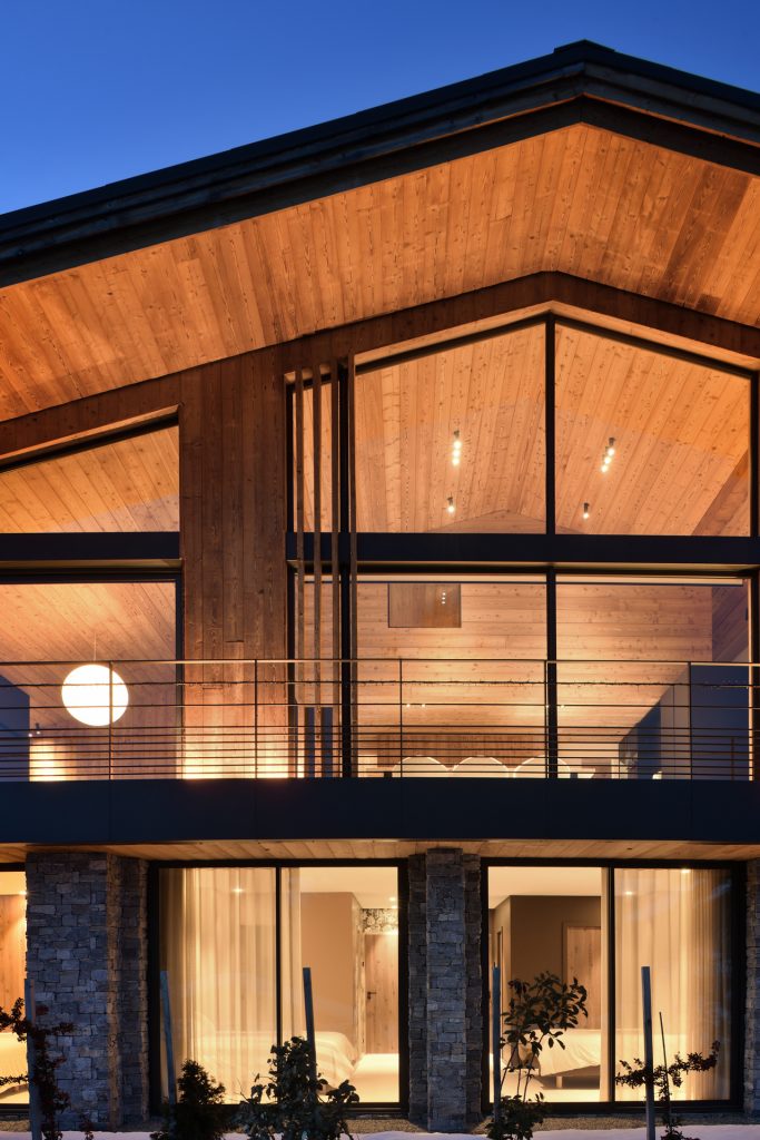 Ce dialogue constant intérieur/extérieur offre une atmosphère chaleureuse et sophistiquée, où la montagne devient partie intégrante de l’expérience quotidienne. Dans ce chalet, l’architecture intérieure n’accompagne pas seulement la vie alpine, elle la sublime et s’y fond entièrement.