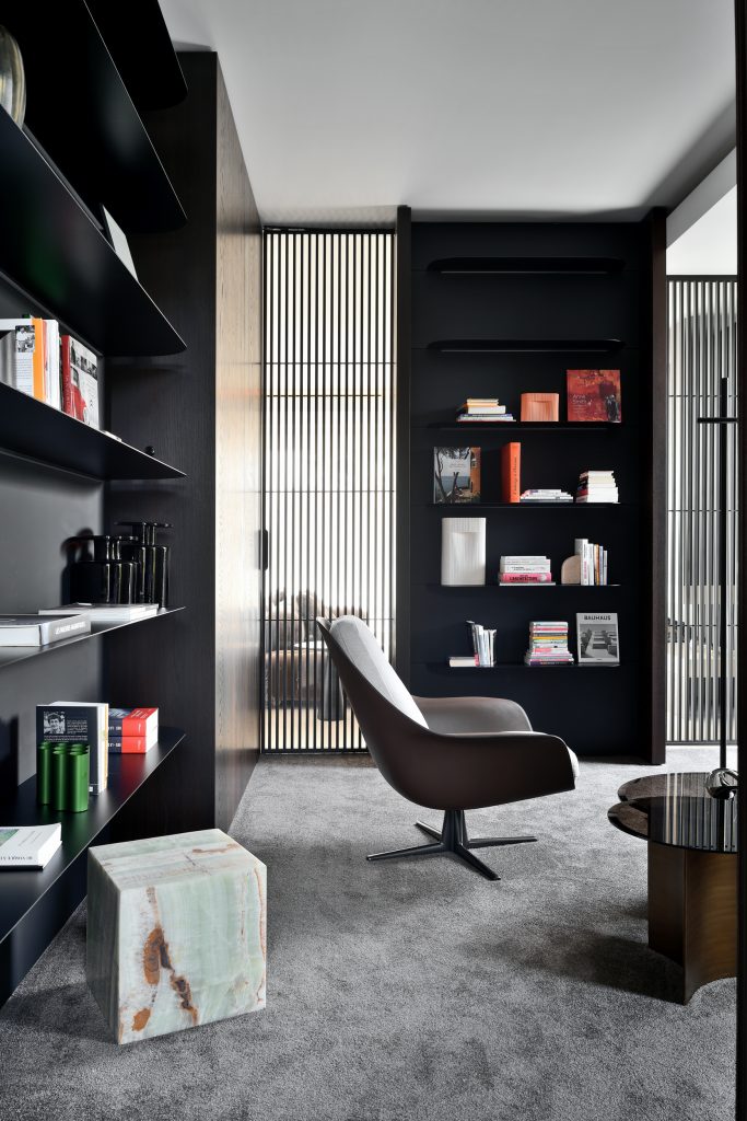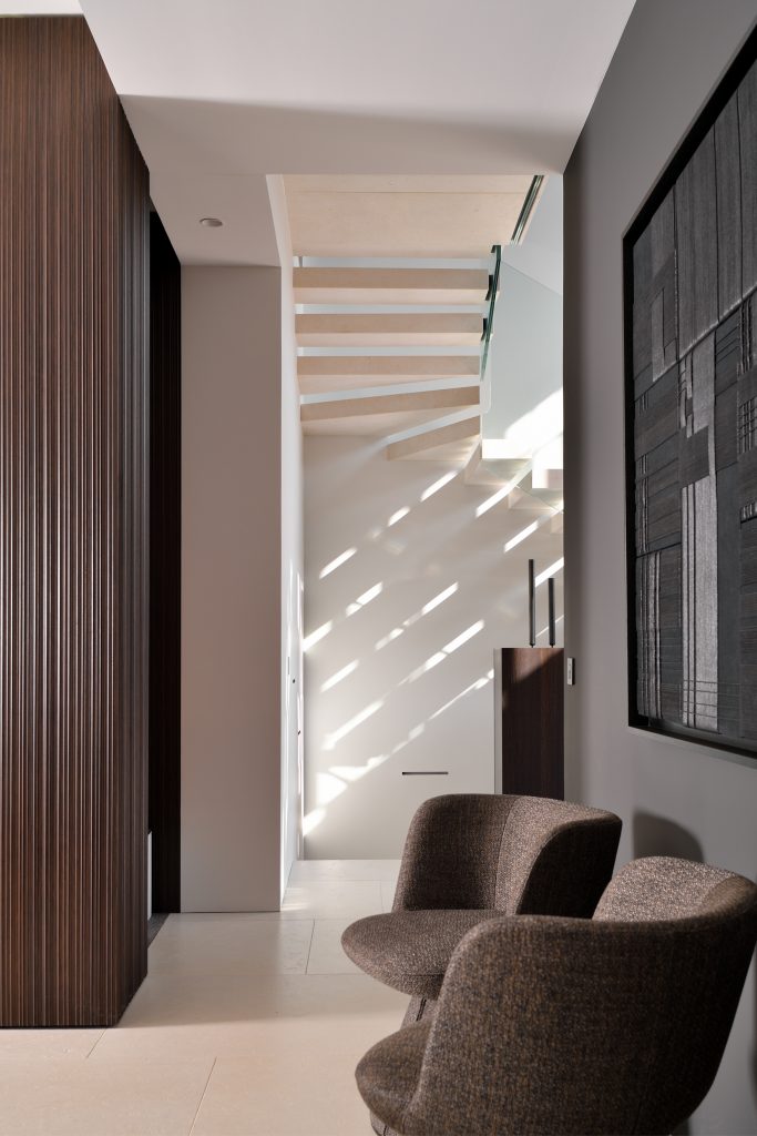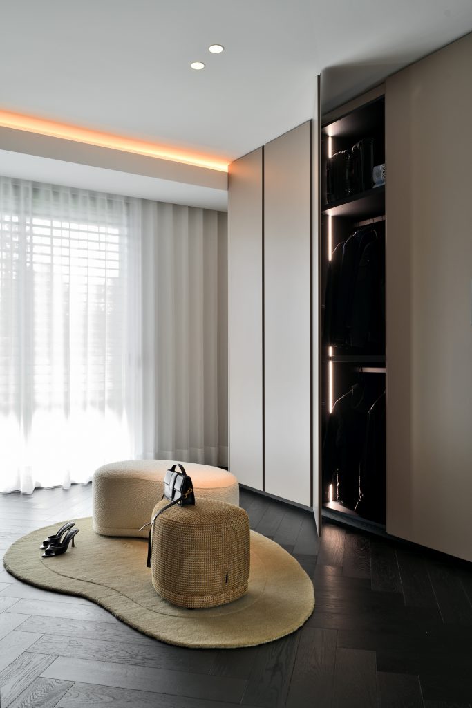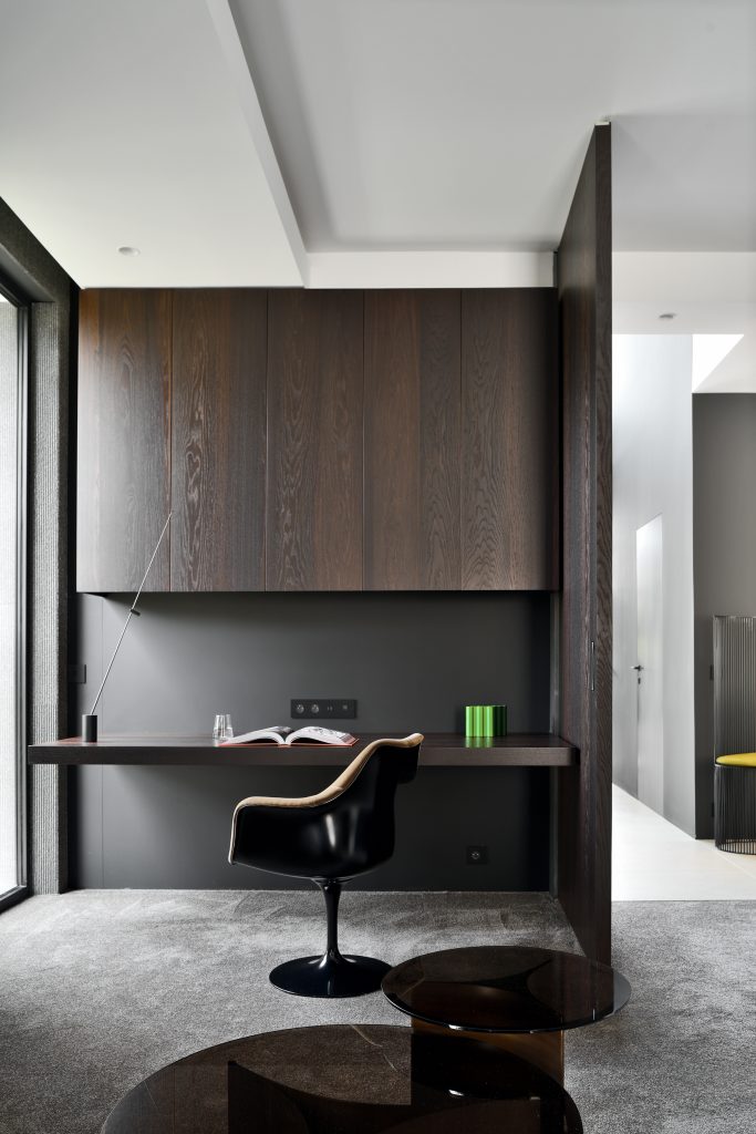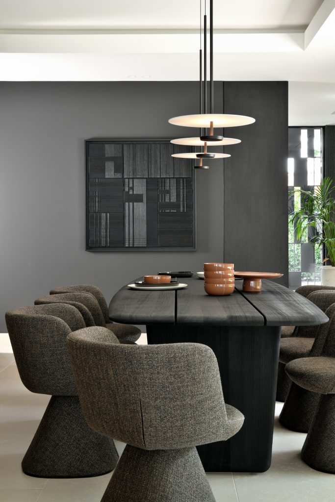 Les matériaux naturels – chêne, noyer, métal et pierre – habillent les sols, murs et meubles sur mesure. Leur association crée une atmosphère chaleureuse et intemporelle, tout en valorisant un design intérieur haut de gamme. La lumière, véritable élément central du projet, sculpte les volumes grâce à des suspensions graphiques, des spots encastrés et des éclairages indirects, conférant à chaque pièce une ambiance changeante et raffinée.